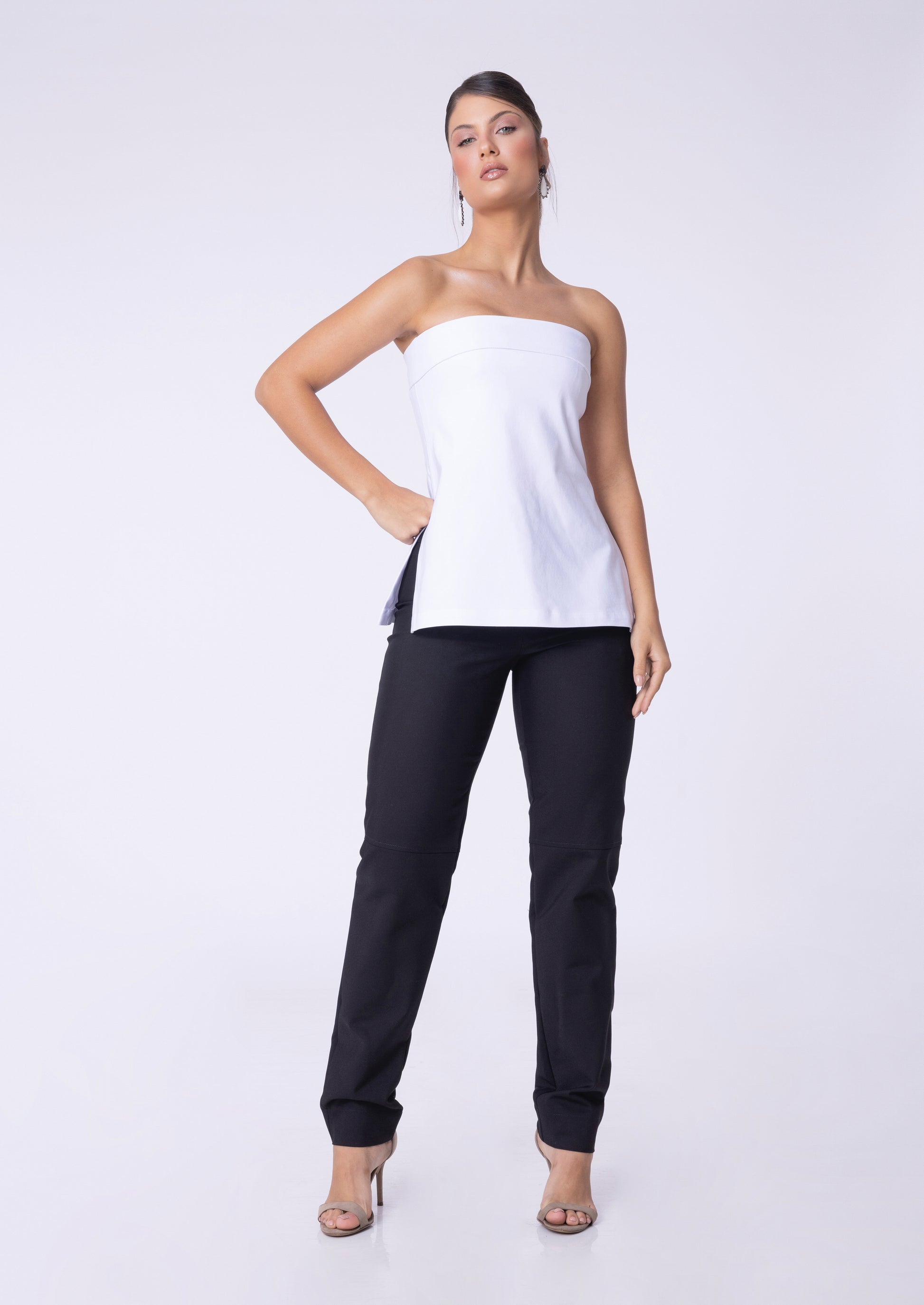 Blusa tomara que caia com aberturas laterais e fechamento em zíper.