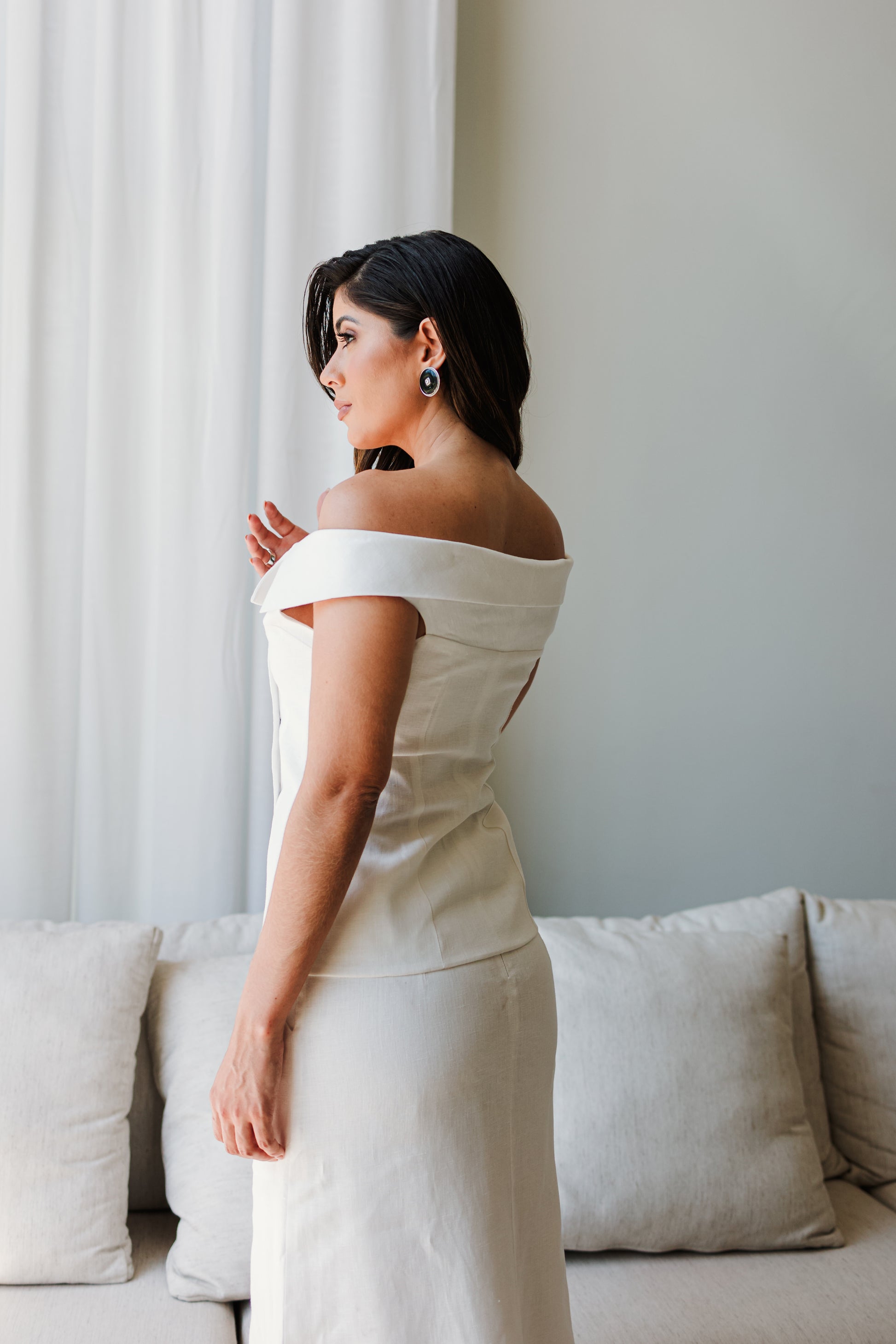 Blusa de linho puro ombro a ombro com botões frontais, criando um design diferenciado.